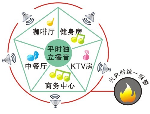 多功能区独立播放音乐,比如咖啡厅可以播放幽静淡雅的音乐:健身房根据运动强度可以播放气势宏大或轻快有节奏的音乐等。如遇突发火情,消防中心可以即刻切断各区正在播放的音乐,统一播放消防报警,疏散人群。
