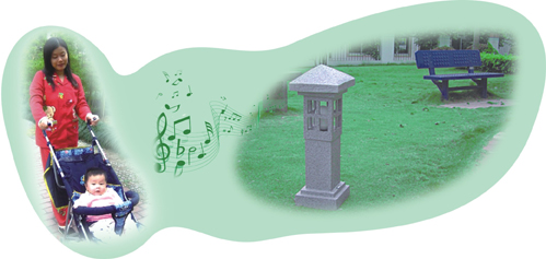 在小区绿化休闲区设计适合周边环境的草地音箱,业主闲庭信步,轻松愉快的音乐仿佛从自然草木中悠然而出,令其陶醉其中。