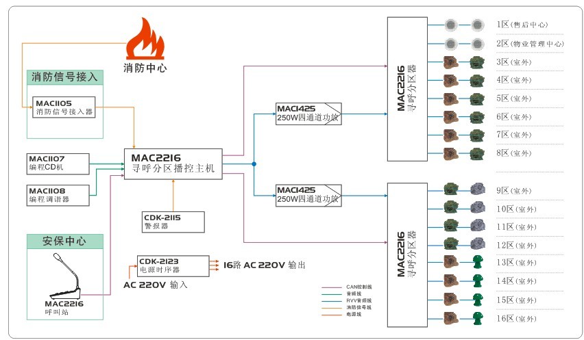 公共广播系统通过消防信号接入器自动接受消防中心信号,同时触发相应设备,实现消防联动报警语音播报,组织人员疏散,减少人员伤亡。