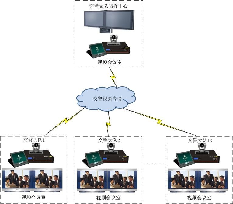 为了节省公安交警系统网络资源,本次高清视频会议系统采用分布式对等组网方式,充分利用各大队富裕带宽,尽可能节省中心节点和骨干网带宽占用。