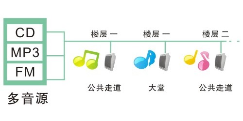 2、公共走道:矩阵式广播,不同楼层不同音乐