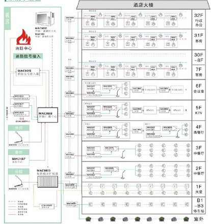 公共广播系统通过消防信号接入器自动接受消防中心信号,同时触发相应设备,实现消防报警,同时能实现N±1、2、3、4等方式的邻层报警功能,帮助客人及酒店工作人员有组织的进行撤离。