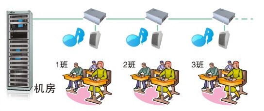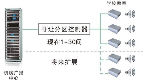 系统通过音频矩阵,可以扩展8*矩阵广播,实现多音源播放,全面满足校园不同区域播放不同内容的要求;8分区的基础