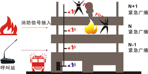 公共广播系统通过消防信号接入器自动接受消防中心信号,同时触发相应设备,实现消防联动报警语音播报,组织人员疏散,减少人员伤亡。